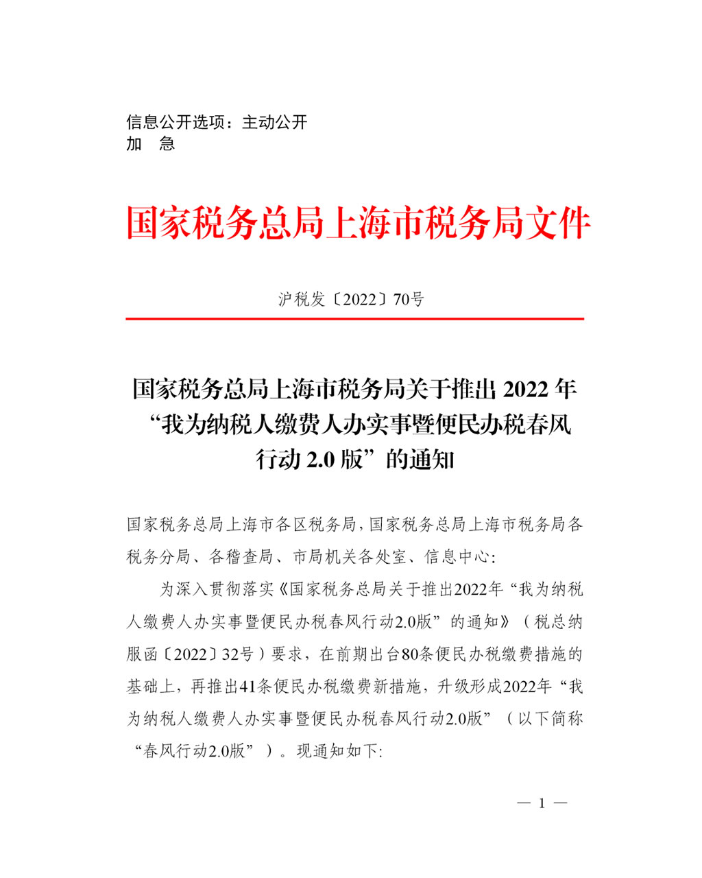 为深入贯彻落实《国家税务总局关于推出2022年“我为纳税人缴费人办实事暨便民办税春风行动2.0版”的通知》(税总纳服函〔2022〕32号)要求,在前期出台80条便民办税缴费措施的基础上,再推出41条便民办税缴费新措施,升级形成2022年“我为纳税人缴费人办实事暨便民办税春风行动2.0版”(以下简称“春风行动2.0版”)。现通知如下: