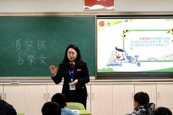 青年干部毛杉、韩佳奇带领小朋友们温故知新,首先复习了前几堂课所学习的税收的意义与功能,又为小朋友们介绍了一个新税种——个人所得税,在课堂的最后还鼓励小朋友们能在日常生活中积极成为小小税务宣传员,让小朋友们树立起了对纳税工作的宣传意识。