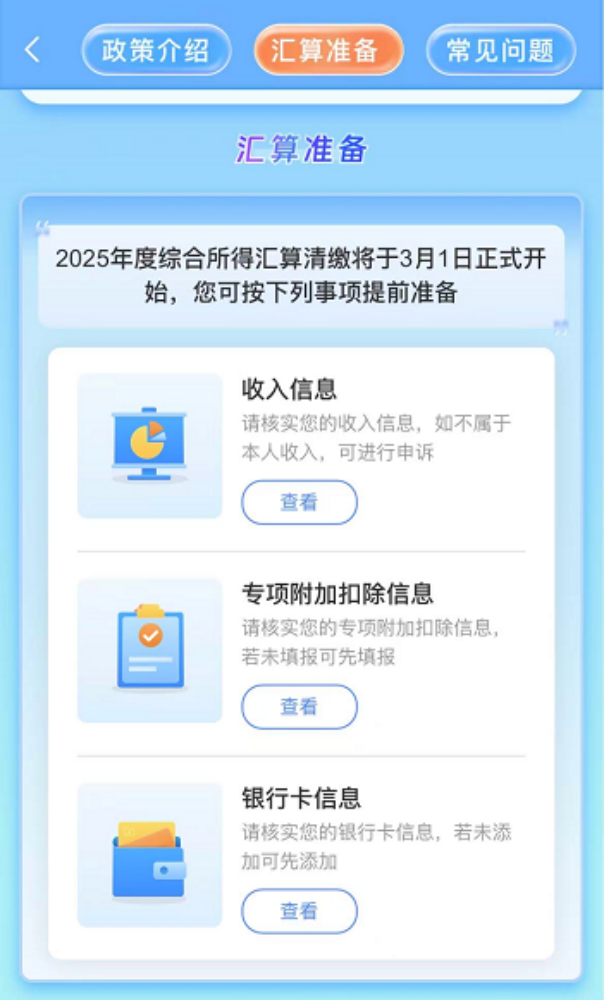 答:年度汇算需要做的准备工作,您可以登录个人所得税App首页,点击进入“2025综合所得年度汇算”专题页,点击【汇算准备】核实您的收入信息、专项附加扣除信息和银行卡信息。