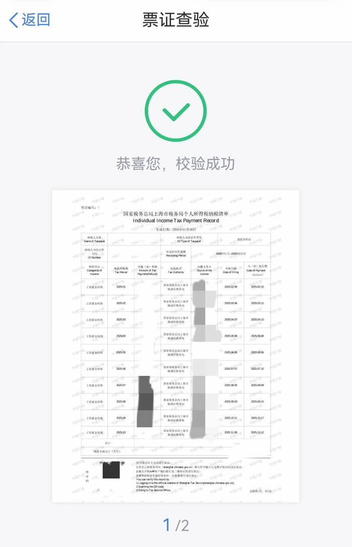 一是打开手机上的个人所得税App,点击首页右上方【扫一扫】,扫描个人所得税纳税记录左下方二维码,显示“恭喜您,校验成功”即可证明其真实性啦。